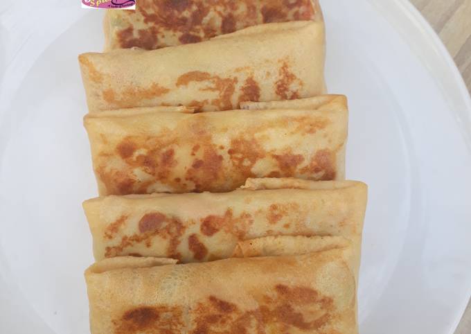 - Place a pan on medium heat and grease with butter or margarine. Gently place the stuffed crepes on the pan and cook until crisp and golden brown on both sides..